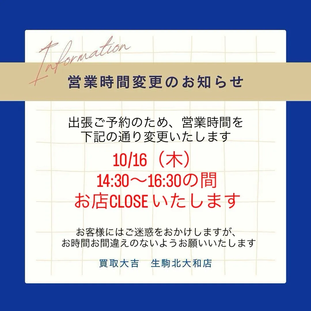 10/16(木)営業時間変更のお知らせ 2025/10/09 10/16(木) 出張ご予約のため、営業時間を下記の通り変更させていただきます。 14:30~16:30の間、お店CLOSE お客様にはご迷惑をおかけいたしますが、 お時間お間違えのないようにお気を付けくださいませ。